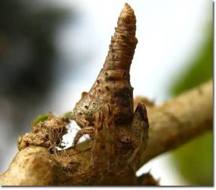 Заметить этого паука на дереве практически невозможно. Высокий «сучок» — это у него живот. Под ним, приглядевшись, можно заметить лапки, и между ними и голову.