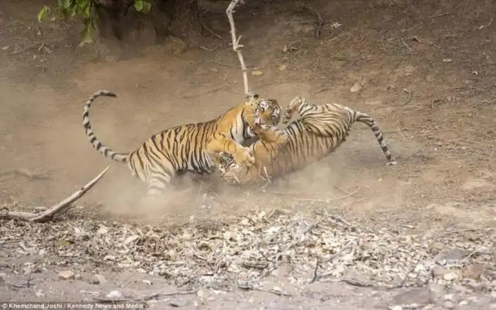 Фотографу удалось снять жесткую схватку тигрицы и взрослым самцом, который вторгся на её территорию.