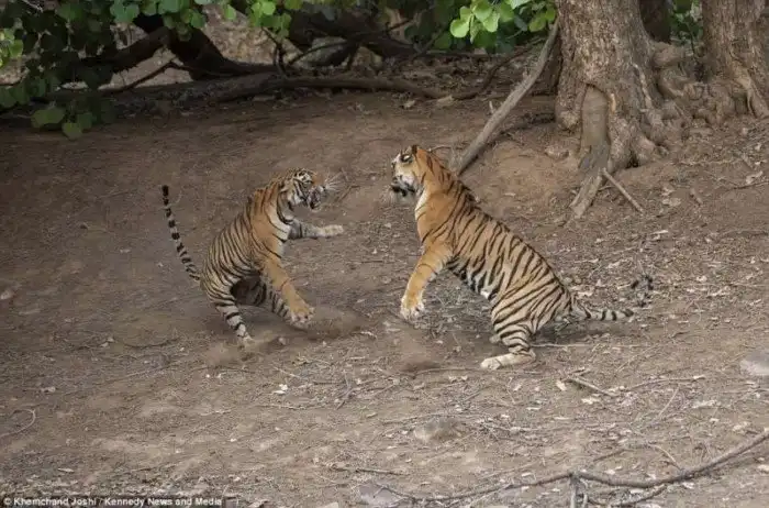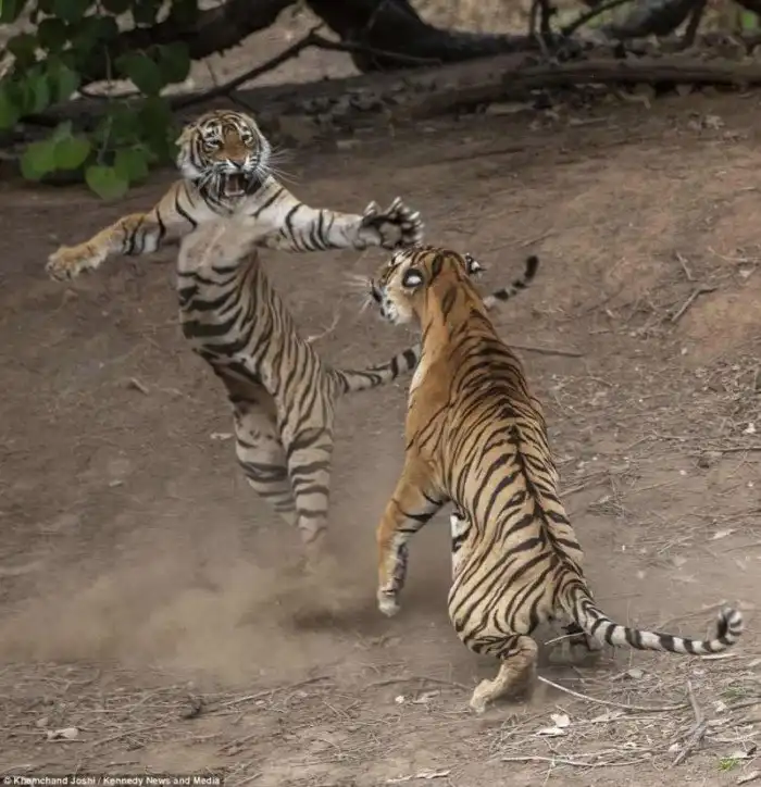 Слева — разъярённая тигрица. Справа — наглец, которые пришел на её территорию.