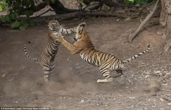 Самки тигров обычно мельче самцов, но тут силы и размеры были равны.