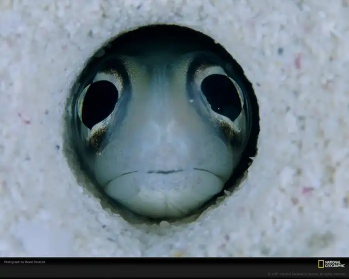 Выглядывает из своей норы. (Фото David Doubilet):
