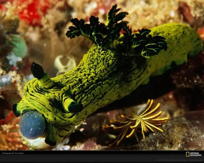 Национальный парк Комодо в Индонезии. Голожаберные моллюски лишены раковины. Они одни из самых ярко окрашенных и многообразных по форме морских беспозвоночных животных. (Фото Tim Laman):