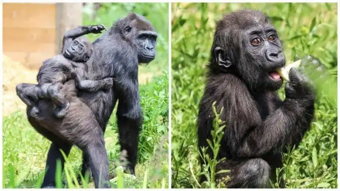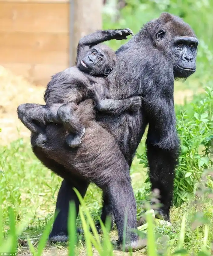 Годовалая Аяна - западная равнинная горилла, живущая в Бристольском зоопарке, одном из старейших в Англии. Этот вид горилл в дикой природе находится на грани полного исчезновения, и лишь заповедники оставляют надежду на его сохранение. Аяна очень любит кататься у мамы на спине!