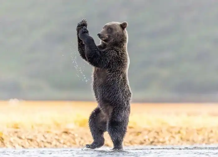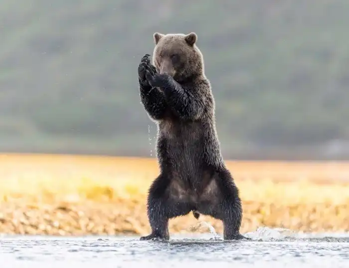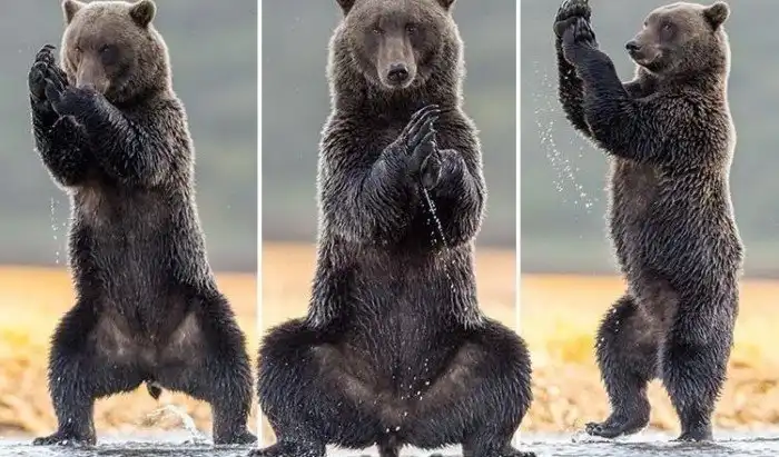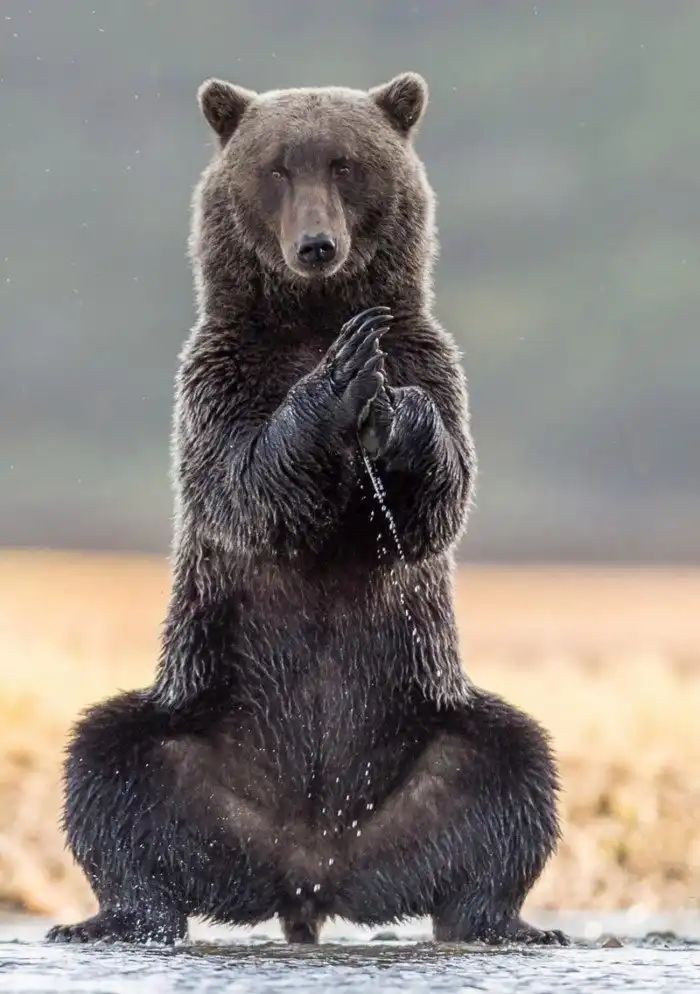 Один из проживающих на Аляске медведей гризли решил попрактиковался в йоге и продемонстрировал некоторые расслабляющие позиции. Он встал на задние лапы, а передние сложил вместе, словно хочет помолиться.