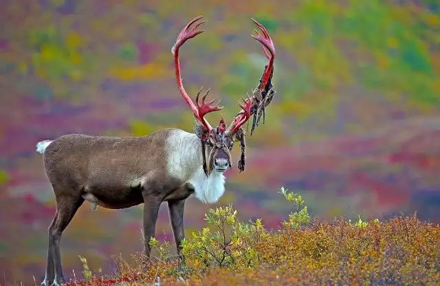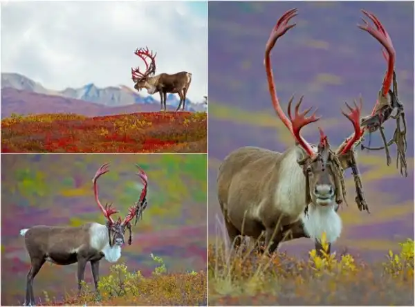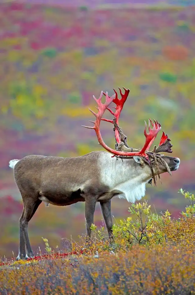 Молодые рога у оленей покрыты бархатистой кожицей, снабжающей их питательными веществами и кислородом. Когда рога отрастают и наступает время гона, бархат лохмотьями слезает. Процесс не вызывает дискомфорта у оленей, но выглядит это пугающе. Этот процесс в начале осени занимает всего пару дней. 70-летний биолог из Калифорнии Гэри Крамер смог сфотографировать оленя во время процесса избавления от бархата в национальном парке Денали, Аляска.