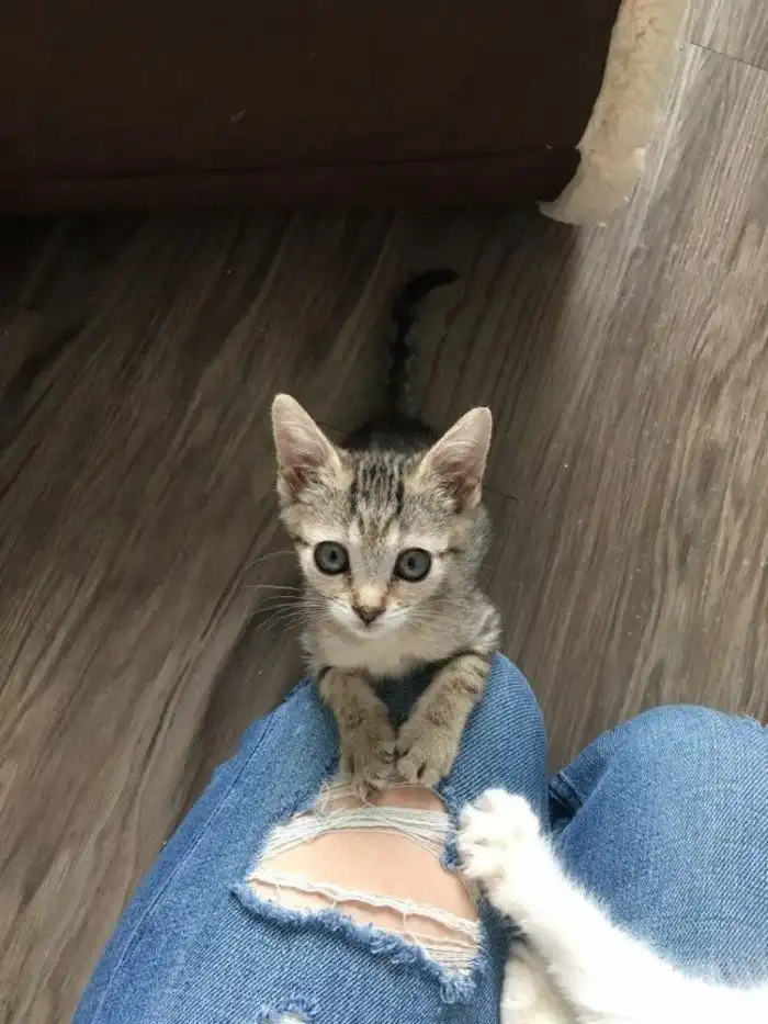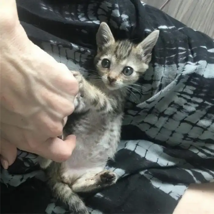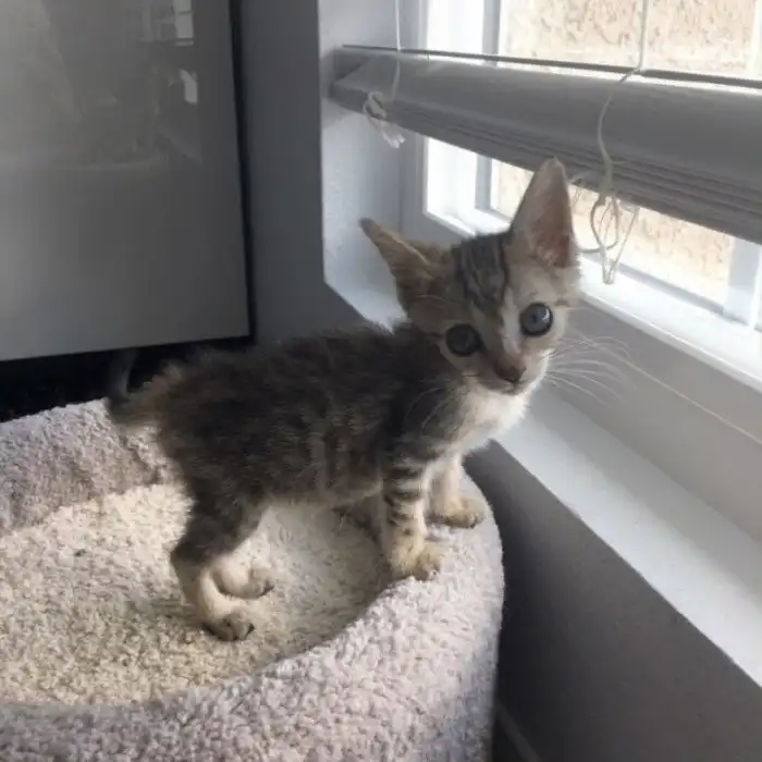 Этот крошечный полосатый котенок по размерам в два раза меньше обычных котят своего возраста. Он был найден вместе со своими десятью братьями и сестрами и единственный из них выжил после неизлечимой инфекции…