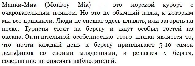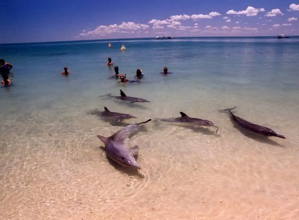 Это замечательное место расположено в заливе Шарк, Западная Австралия. Каждое утро начинается с радиорепортажа о количестве дельфинов и людей на берегу. Из репортажа вы также можете узнать ожидаемое количество дельфинов на сегодняшний день. Традиция кормить дельфинов на берегу началась в 1964 году. Жена местного рыбака увидела, что дельфин плавает поблизости и дала ему рыбу. Ему понравилось и на следующий день дельфин вернулся за новой порцией. Со временем Чарли, именно так местные жители назвали этого дельфина, начал приводить своих друзей на пляж. Все это стало привычкой — Чарли и его друзья все чаще приходили на мелководье для кормления.