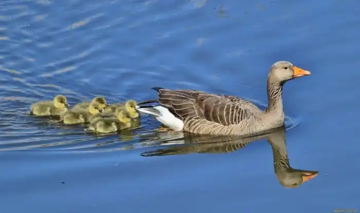 Весной гуси делают гнездо из своих же перьев, листьев и палок. Самка откладывает от 4 до 12 яиц. После вылупления маленькие и мокрые гусятки сидят под мамкой сутки, чтобы обсохнуть. Через несколько дней родители тащат малолеток к воде, чтобы те научились добывать себе пищу. Во время подготовки детишек гуси становятся очень злыми. Если подойти к ним в это время, то можно серьезно огрести зубастым клювом по нежным бедрам. Осторожней, пожалуйста.