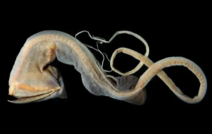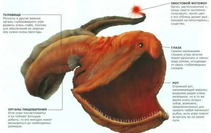 Несмотря на огромные размеры пасти, пеликаний угорь лишен многих «рыбьих» атрибутов. У него нет ни чешуи, ни плавательного пузыря, ни рёбер, ни нормального скелета вообще. Есть только несколько деформированных костей, тонких хрящей и маленький череп. Зато, на конце хвоста эволюция прицепила ему яркий велосипедный фонарик, испускающий розовый свет или красные вспышки, чтобы привлекать добычу и предупреждать тихоокеанских глубоководных дальнобойщиков об опасности столкновения.