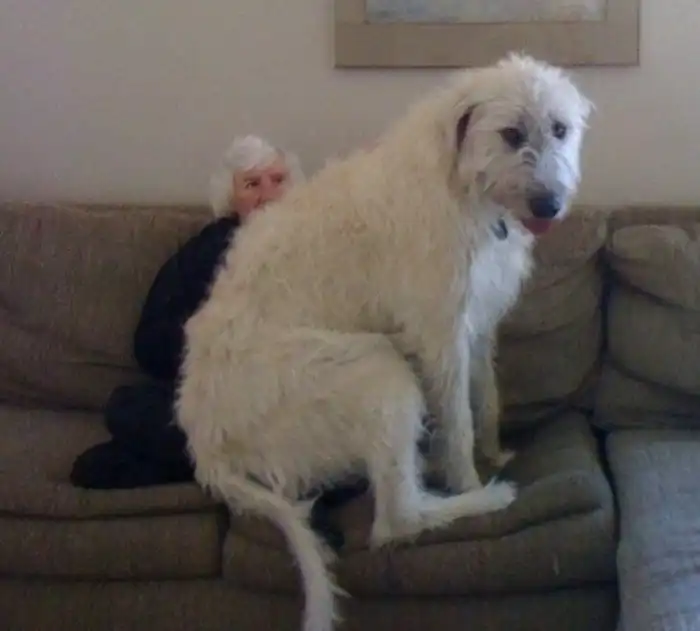«Наш ирландский волкодав сидит на коленях у бабушки. Он понятия не имеет, насколько он большой»