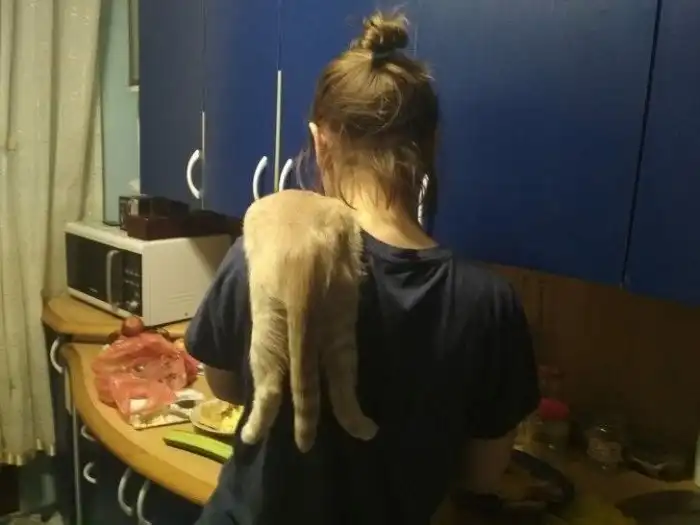 «Кот любит залезть и кататься на плечах. Вот так готовим ужин. Висит и мурчит»