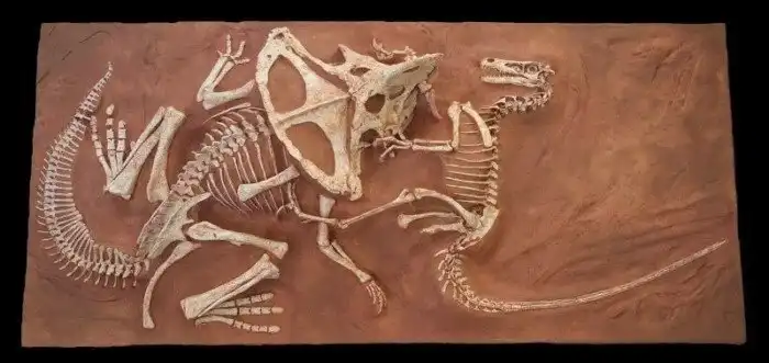Да, наш гость имел массу птичьих черт. Но не спешите кормить его с рук, ведь как вы уже догадались — этот индюшонок может не только клюнуть в причинное место, но и оторвать его под корешок. О методах охоты нашего капитана Крюка известно достаточно много. Всё благодаря находке 1971 года, заставившей пребывать VAHUE весь мир. Пред взором общественности предстало два скелета, вцепившихся друг в друга. Один принадлежал нашему пернатому другу, а другой — ботану с воротником и мощным клювом — протоцератопсу. Две животины погибли в настоящей схватке. Задняя конечность велика застряла в шее травоеда, а передняя — меж челюстей отважного ботана. Как и полагается сейчас, хищник пытался проколоть шейную артерию, но встретил непосильный отпор и сам попался в клюв-капкан.