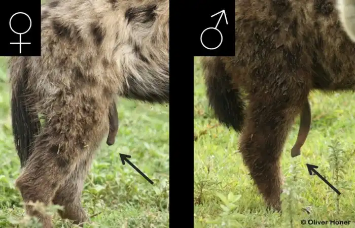Клитор пятнистых гиен очень большой и нередко достигает 15 см! Половые губы формируют мешковидную складку, похожую на мошонку. Но, всё же, отличить парня от девчонки можно. Клитор самок не имеет шейки, а его кончик — тупой. У самцов член имеет узкую шею и резкий заостренный конец (я не знаю, как эта информация пригодятся тебе в жизни, но теперь эти знания в твой голове. Не благодари!)..
