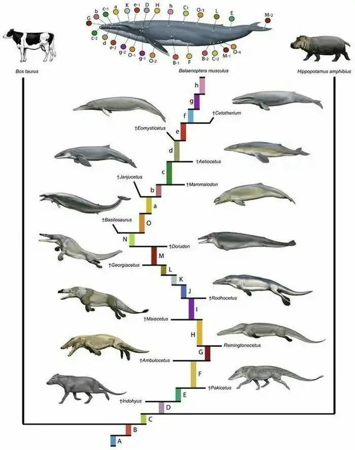 Далее по цепочке идет амбулоцеты и ремингтоноцетиды (если прочли с первого раза, держите конфетку). Они точно являются переходным звеном между сухопутными млекопитающими и китообразными. Жили ~43 млн лет назад в Индии и Египте, были внешне нечто средним между выдрой и крокодилом. Наряду с чертами китов — примитивными зубами для ловли рыбы, имели и сухопутные черты — ноздри на конце морды. Длина 3 метра.