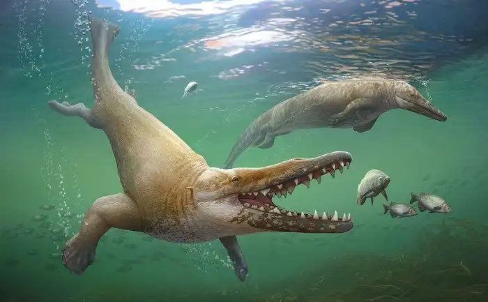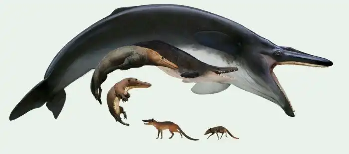 Далее идут базилозавры и дорудонтиды. Они выглядели почти как нормальные киты, ведь имели хвостовой плавник. Но имели мелкие задние конечности для поддержки партнера во время спаривания и крохотный мозг. А еще они не могли в эхолокацию, как современные киты.