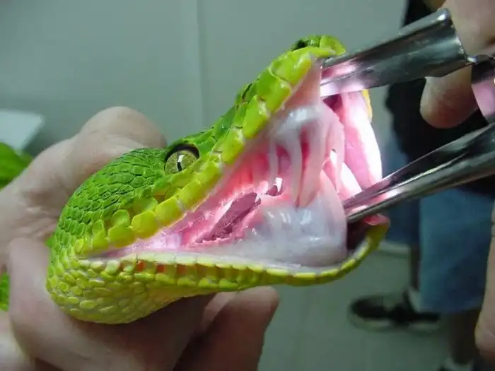 Отдельного внимания заслуживает пасть зверюги. Как и остальные удавы собакоголовый не имеет ядовитых желез. При охоте наш гость полагается исключительно на ловкость и силу укуса. Но главным инструментом для ловли добычи, конечно же, являются зубы. Смертоносное оружие достигает от 3,5 до 5 см в длину.
