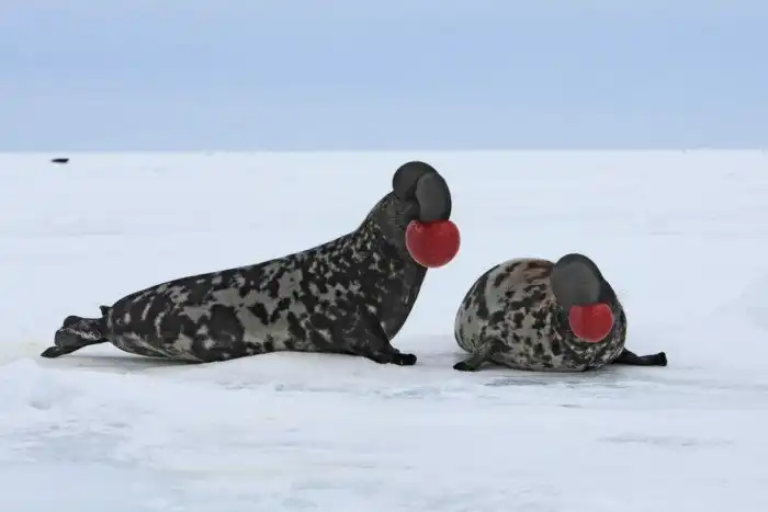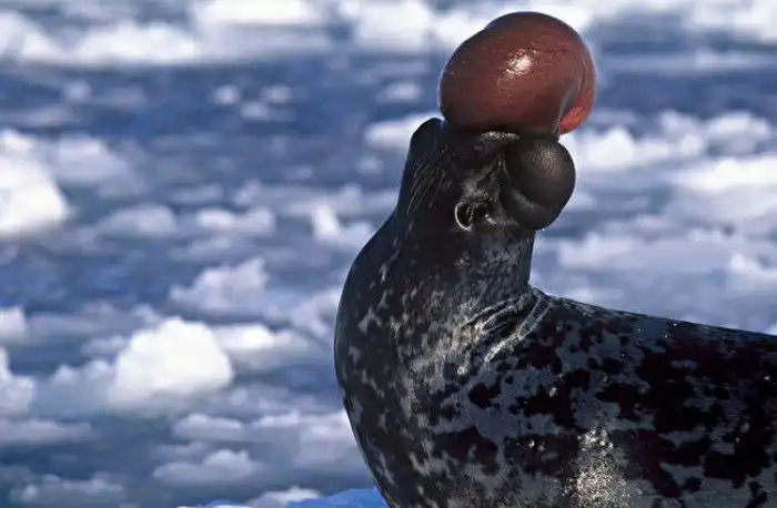 На льдинах и побережьях собираются толпы самцов и самок. Девушки будут глазеть на десятки нахлобученных тестостероном мужчин, чтобы выбрать одного, единственного. Тут-то в дело и вступают эти адские воздушные шарики на носу парней.