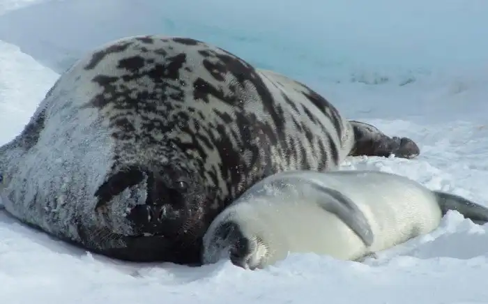 Через 11 месяцев мама родит детеныша, а отец заглянет к своей семейке, чтобы месяц побыть с женушкой, еще раз ее оплодотворить и снова смыться. Пока папа в семье, он очень нежен как к самке, так и к своему прошлогоднему отпрыску. Он защищает их от хищных врагов (акулы, медведи, косатки) и других хохлачей.