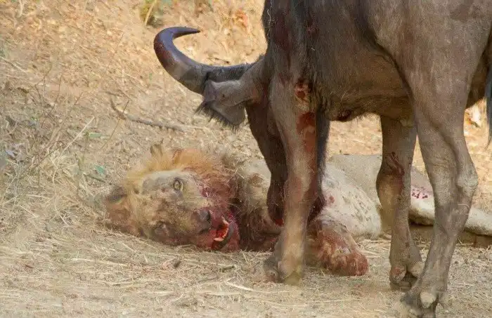 Успех успешного противостояния буйволов с львами кроется в двух факторах. Во-первых, эти животные сами по себе крупные и мощные. Взрослый бык достигает 1.8 метров высоты в холке и массы 1 000 килограмм. У него хорошо развита мускулатура и рога, образующие крепкий костяной щит.
