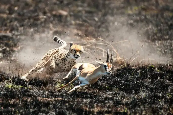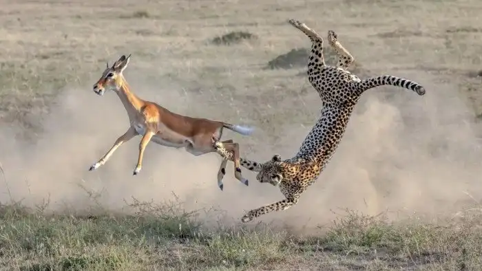 Наш привычный гепард весит порядка 50 кг, 90 сантиметров в высоту и регулирует популяцию копытных, типа антилоп импал, молодых гну, газелей, и совсем не копытных зайцев.