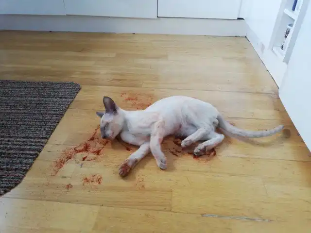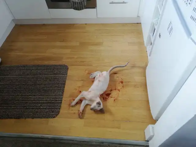 Автор этих фото зашел на свою кухню и чуть не упал в обморок от страха. Он увидел жуткую картину, как будто в этой комнате снимают кровавый триллер. Его любимый кот лежал на полу и двигался, а на полу все было.... нет, вовсе не в крови, а в паприке!