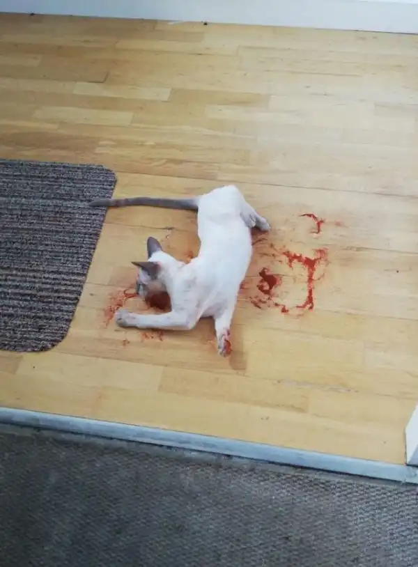 Усатый негодяй разгрыз пакетик с кроваво-красной паприкой, рассыпал ее по полу и улегся прямо в ней, имитируя сцену убийства. Да уж, котейка знает, как сделать удачный розыгрыш, но ужина хвостатому не видать.
