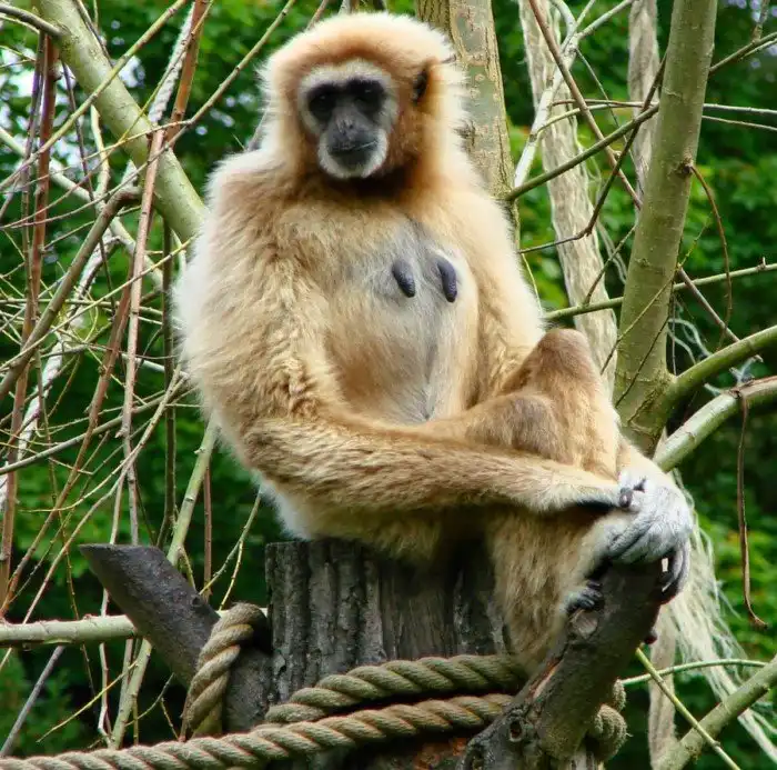 Как и все представители семейства, Белорукий Гиббон выделяется своими лапищами. Сильные и длинные конечности позволяют животине беспрепятственно передвигаться в кроне деревьев, раскачиваясь с ветки на ветку. На земле наш гость чувствует себя неловко. Среди прочих родственничков, Белорукий Гиббон выделяется своими белыми лапками (кто бы мог подумать!). Основной окрас шерсти может варьироваться от бежевого до чёрного, но неизменной фишкой остаются белые «перчатки» и «маска», обрамляющие запястья и мордашку зверюшки.