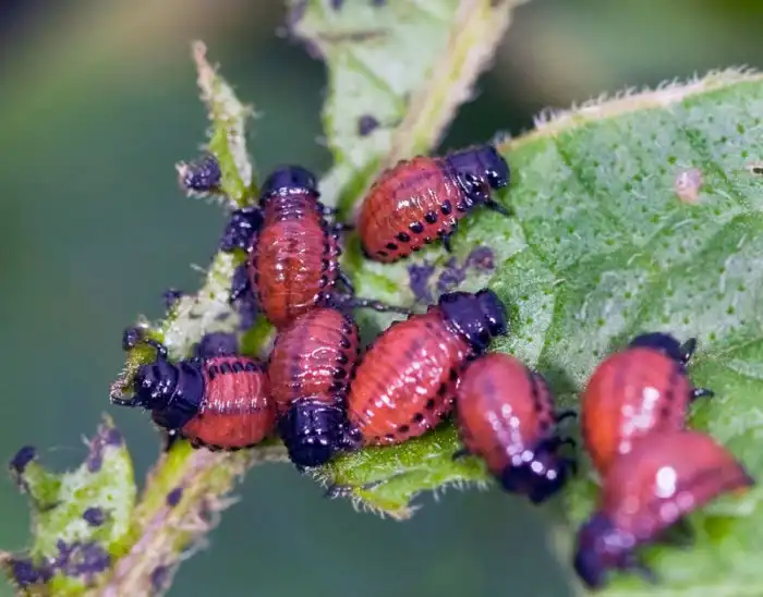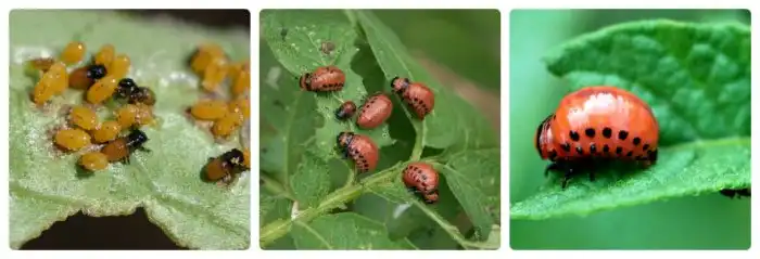 Особо опасны не взрослые особи, а их личинки. После вылупления, красные дьяволята становятся настоящей машиной по уничтожению растительности. Выделяют 4 стадии их развития. В первой личинка выгрызает мякоть листа снизу. Во второй, уже подросший Колорадский Жучонок выползает наружу, оставляя от листа лишь прожилки. В третьих и четвёртых стадиях личинки покидают родной куст и путешествуют в поисках нового источника пропитания и места для окукливания.