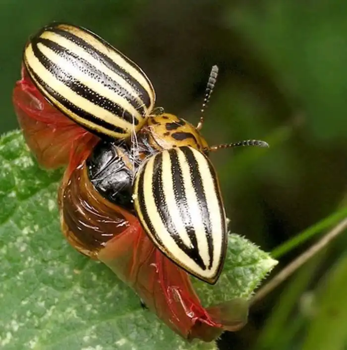 Описывать в деталях нашего гостя из семейства листоедов не имеет смысла. Каждый видел этих вредителей на своём участке. Крупные насекомые (от 8 до 12 мм) с жёсткими крыльями и полосатыми спинками являются предвестниками беды для большинства посадок семейства паслёновых. Любимое блюдо ненасытных монстров — листья картофеля, но если их нет, с удовольствием полакомятся томатом, сладким перцем, баклажанами и другими культурными растениями.