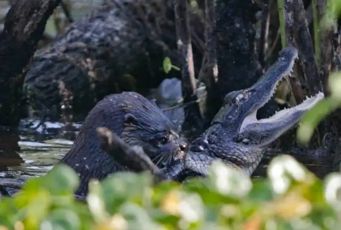 Крупную добычу животные убивают толпой. Сила и наглость позволяют Выдрам охотиться даже на кайманов, аллигаторов и анаконд. Эти ребята настолько уверены в себе, что без труда нападают на ягуара — крупнейшего хищника Южноамериканского континента. Не верите? Смотрите сами!