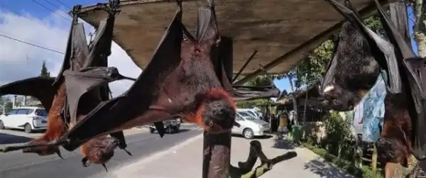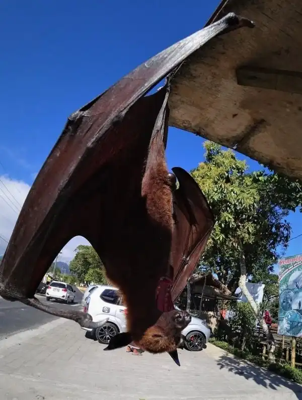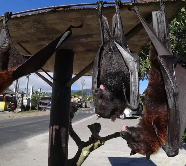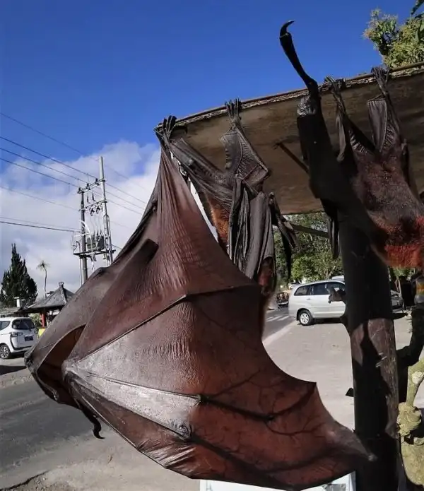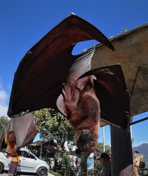 Туристы, которые побывали на острове Бали, увидели на одной из палаток висящих огромных рукокрылов. Вначале они подумали, что они привязаны, но присмотревшись поняли, что нет. Может быть, "хозяин" подрезал им крылья, чтобы они не улетели? Но тоже нет... Как оказалось, владелец лавки приручал их с самого детства. Теперь у него такие "милые" летучие лисицы числятся в питомцах.