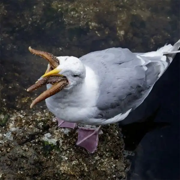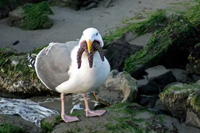 Чайки-каннибалы, пожирающие своих сородичей, представляют собой то еще зрелище, но еще хуже они выглядят, когда пытаются заглотить морских звезд. В этот момент пернатые больше похожи на каких-то инопланетных тварей с торчащими из клюва щупальцами.