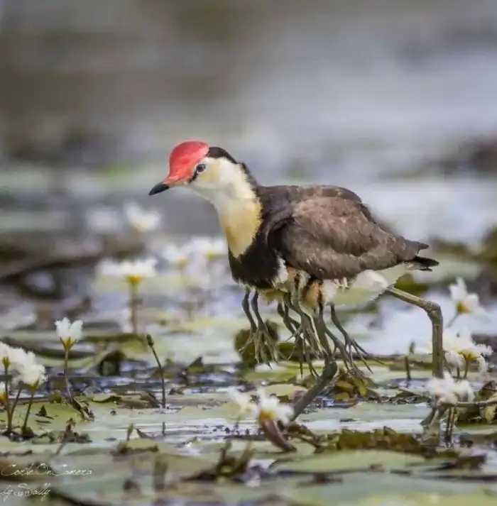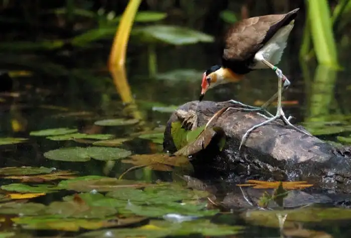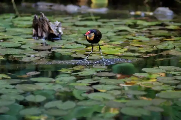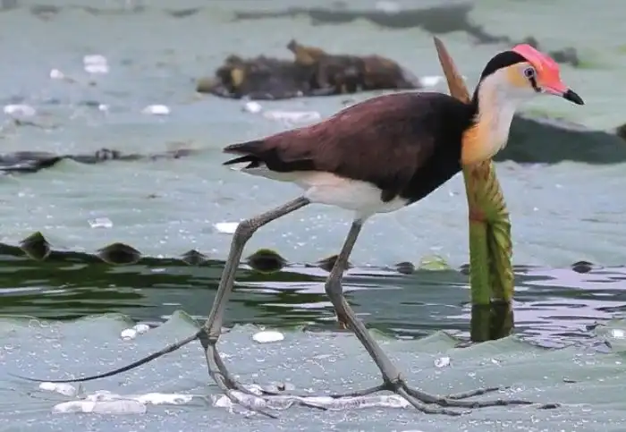 Наверняка, первое, что привлекло ваше внимание при взгляде на нашего героя — его лапы. Действительно, обычными их назвать сложно. Огромные пальцы, увенчанные длинными когтями, созданы для того, чтобы воплотить чудо о хождении по воде в реальность. Конечно, с Иисусом Христом птица не сравнится, но без труда гулять по листьям водных растений — в его компетенции. На руку птахе играет как малый вес, так и его равномерное распределение по поверхности засечет непропорционально огромных лапищ.