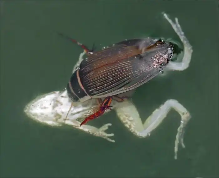 Если жрать нечего совсем, оборзевшее создание кидается на лягушек и тритонов. Нет, мы не шутим, это насекомое реально охотится на животных в несколько десятков раз больше себя. Понятно дело, что один плавунец, даже несмотря на всю свою борзость, не осилит такую добычу. Поэтому хищники гасят земноводных толпой. Одно насекомое, хорошенько цапнув ничего не подозревающую лягуху, призовёт целый рой своих сородичей. От десятка голодных и разъярённых плавунцов жертве уже не спастись. Кровавое месиво закончится лишь тогда, когда от тушки бедной хладнокровной животины ничего не останется.
