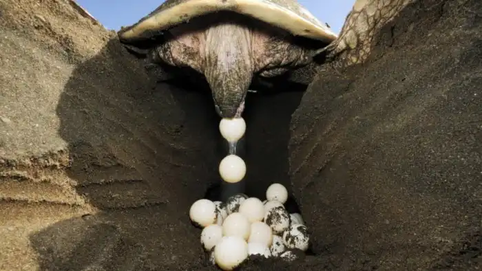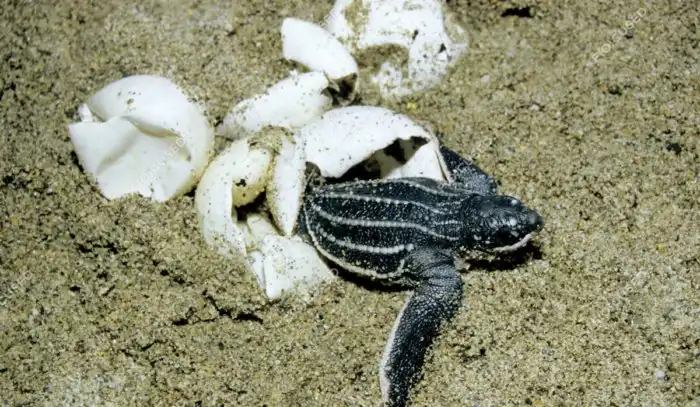 Черепашат мамочка выводит на песчаных берегах. Кладку животина помещает в метровую яму. Незнающий человек может подумать, что какой-то чокнутый обожает играть в гольф на пляже. Ведь яйца кожистых черепах походят на маленькие мячики и по виду, и по размеру. Всего таких шариков может насчитываться от 30 до 130.