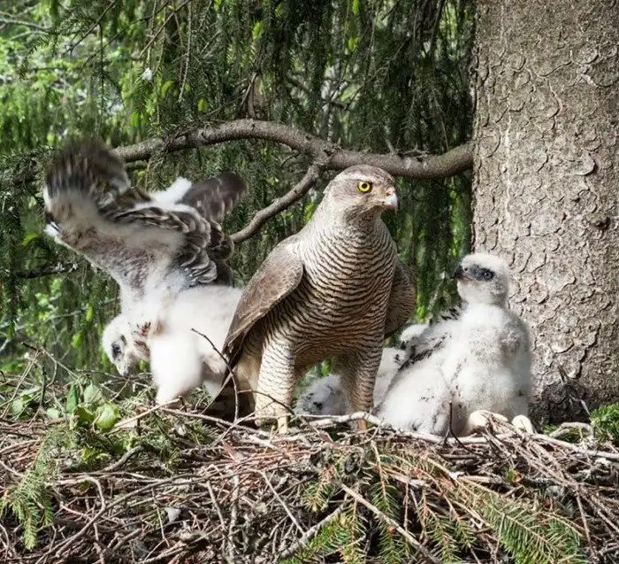А как эти парни в плане размножения? Да вполне себе стандартно. По крайне мере, для ястребиных. На поиск пары тетеревятников пробивает к двум годам. Прелюдиями служат чудеса на виражах. Воздушные танцы сопровождаются криками «киа-а-а-а». Вдоволь налетавшись, каратисты приступают к обустройству уютного гнёздышка.
