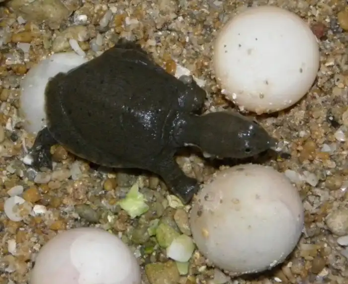 Самке ничего не остаётся, кроме как принять участь матери-одиночки и уплыть на ближайший берег откладывать яйца. Для того, чтобы детишки оставались в целости и сохранности, дамочка придумала хитроумную стратегию. Одну и ту же кладку самка зарывает в три разных места. Но, несмотря на это, яйца триониксов всё равно быстро находятся и уничтожаются местными хищниками, что значительно влияет на популяцию вида.