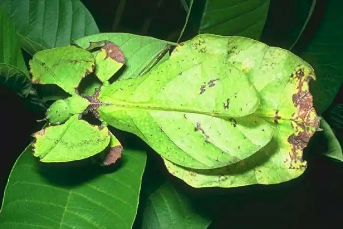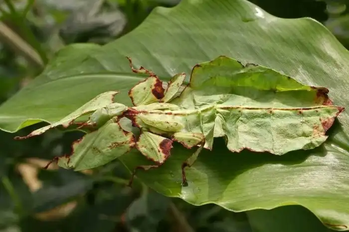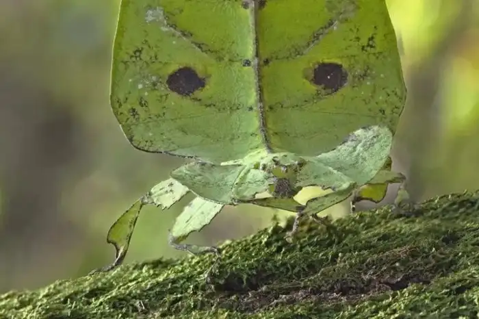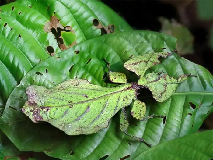 Но и самки не промах. Как не сложно догадаться, лучше всего азиатскую ботву пародируют именно они. Сидячий образ жизни заставляет дамочек максимально сливаться с растительностью. Букахи настолько повысили уровень скрытности, что способны имитировать в своей окраске надкусы насекомых. Сидя на ветке или черешке, самки плавно качают своим телом. Эти странные танцы предназначены не для самцов, а для хищников. Покачиваясь, как листок на ветру, животина становится абсолютно незаметной в кроне дерева.