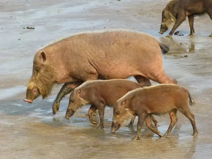 По итогу на свет появляется 2-8 детёнышей. Для будущих покорителей подиума мамаша строит мини-гнездо. Там ребятня проводит первые недели жизни. Спустя 3 месяца молочной диеты, поросята переходят на подножный корм. Но, несмотря на то, что от мамки милкшейков детишки уже не дождутся, они всё равно остаются под её опекой целый год.