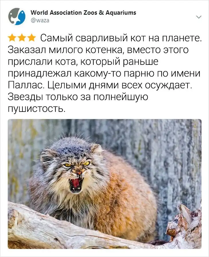 Сотрудники зоопарка в Орегоне решили рассказать о своих животных так, будто они только что купили их в интернет-магазине и теперь пишут отзыв о новом приобретении. В итоге их эксперимент вышел на славу и их примеру последовали другие зоопарки. Так зародился целый флешмоб с хештегом #rateaspecies ("отзывы о животных"), который мгновенно разлетелся по всему твиттеру.