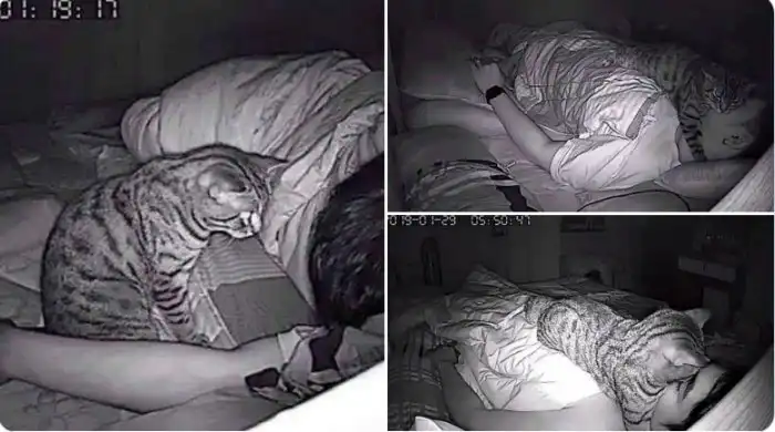 2. Хозяин этой кошки задыхался по ночам, но не мог узнать причину, поэтому поставил камеру. Оказалось, его «душила» безмерная любовь питомца