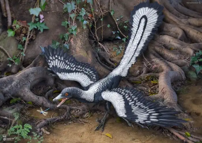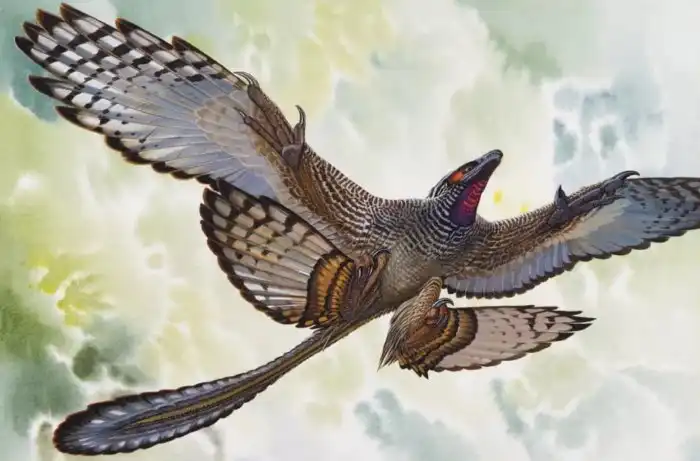 Тот самый четырёхкрылый оперённый динозавр. Очевидно, что перья на задних конечностях животина использовала исключительно для полёта.