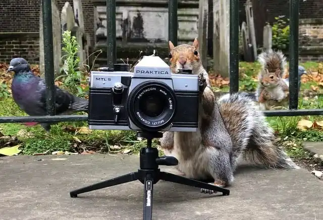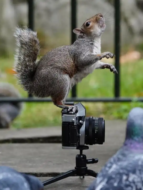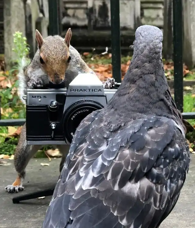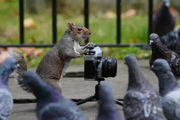 Оказывается, что белки неплохо разбираются в искусстве фотографии. В этом убедился 48-летний фотограф Джефф Мур из Лондона. Однажды он отправился в парк, чтобы протестировать свою старую пленочную камеру. Джефф поставил фотоаппарат на землю и хотел поснимать, резвящихся неподалеку белок. Но оказалось, что пушистые грызуны не захотели быть моделями и сами решили руководить фотосессией. Как раз вовремя прилетели голуби, которые оказались не отказались попозировать перед камерой. В итоге Джефф почувствовал себя лишним и разрешил белкам похозяйничать. Правда, белочкам не хватило сил нажать на кнопку спуска затвора, но зрелище было очень забавным.