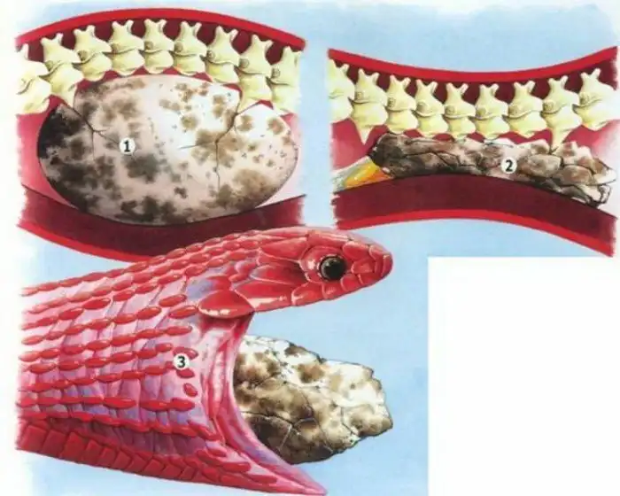 А теперь о самом интересном, третьем пункте. Помните, мы говорили о том, что у нашей героини нет зубов? Забудьте. На самом деле, мы немного слукавили. Зубы у яичных змей есть, только вот находятся они не во рту, а… в позвоночнике.