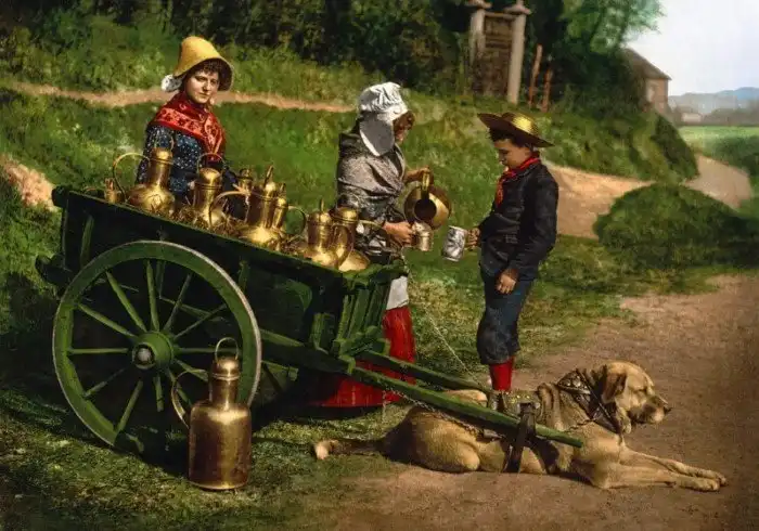 Молоковоз. Фотоснимок конца XIX века с двумя разносчиками молока с тележкой, запряжённой собакой, Бельгия.