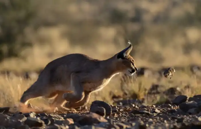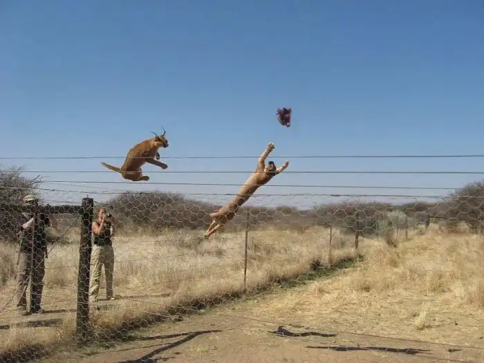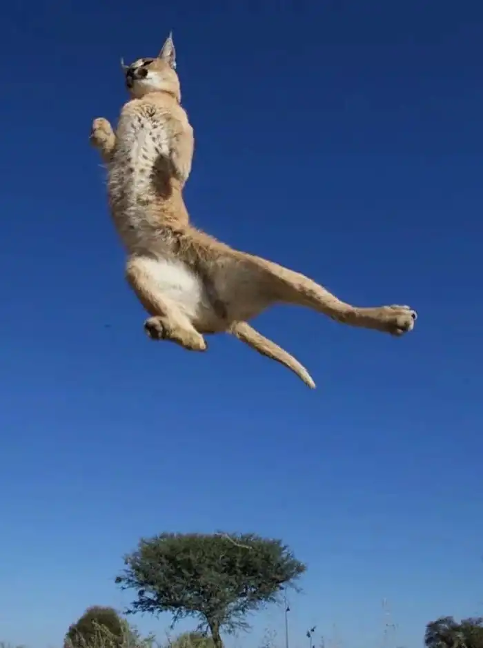 Для чего же нужны такие шпалы? Всё просто — для охоты. Каракал хавает всех обитателей пустынь и степей: от птиц и грызунов, до копытных. Бегун из кошки так себе, да и ростом животина не вышла (всего 45 см в холке), поэтому поджидать свою добычу рыжик предпочитает в засаде. Итак, жертва на мушке, а каракал на взводе, что же дальше? А дальше прыжок! Причём не простой, а достойный олимпийской медали. Одним разом кошак преодолевает расстояние в 4,5 метра!