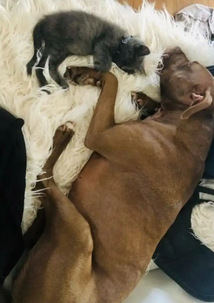 5. "Наша Мэгги очень хотела иметь друга. Мы подобрали на улице котенка и принесли домой. Она думает, что это ее щенок, и теперь они не разлей вода"