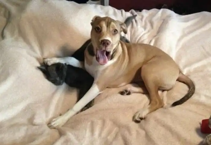 6. "Моя питбулиха просто одержима нашим котом и постоянно его достает. Вчера я поймала ее в такой позе"