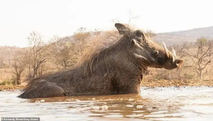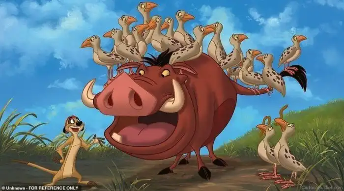 Забавный зверь "повторил" сцену из мультфильма "Король Лев": он позировал на камеру, пока его облепили маленькие птички - красноклювые буйволовые скворцы. Фотограф разглядел в нем вылитого Пумбу: