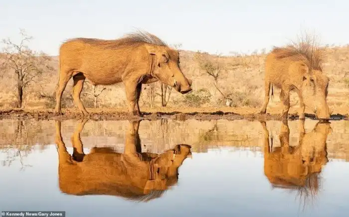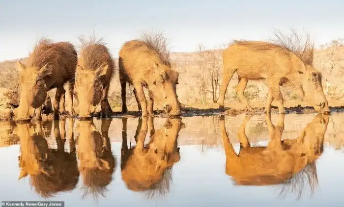"Бородавочники - весьма интересные модели, - рассказывает фотограф. - Мне удалось сделать забавный снимок, когда к одному из них на спину уселось несколько скворцов. Обычно я долгое время жду, пока животные подойдут к воде. Мы провели ночь без сна в своем укрытии, прежде чем дождаться бородавочников".